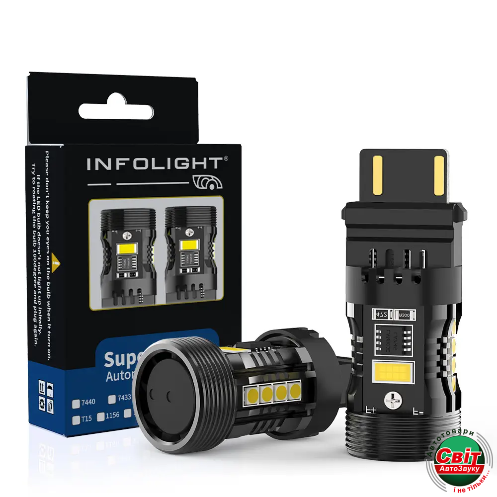 Комплект світлодіодних ламп Infolight P27W (3156) Canbus AmberСвітлодіодні габаритні лампи INFOLIGHT CANBUS — це ідеальне рішення для сучасного авто: лампи з рівномірним розподілом світла на 360° створюють чітку та яскраву підсвітку, забезпечують довговічність, стильний вигляд і повну сумісність з електронікою авто — без помилок на панелі.