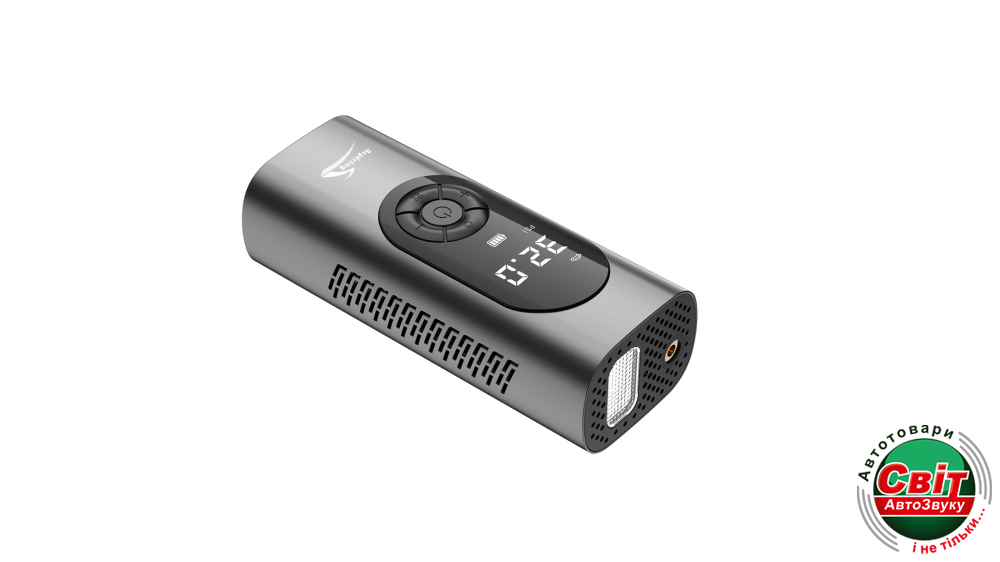 - Багатофункціональний повітряний компресор внаслідок розмірів можна носити з собою, він має тривалий час автономної роботи, цифровий дисплей LCD, рівень шуму до 75 децибел, циркуляційна система охолодження, зручні кнопки і просте управління.