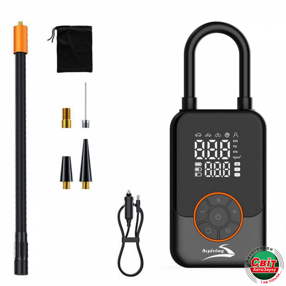 Aspiring Storm 5 оснащений точним цифровим манометром з LED-екраном, який дозволяє легко контролювати тиск у шинах. Функція автоматичного відключення при досягненні заданого тиску забезпечує безпечну експлуатацію та запобігає перенадуванню. Діапазон робочих температур (-20°C до +60°C) гарантує стабільну роботу в будь-яких погодних умовах.