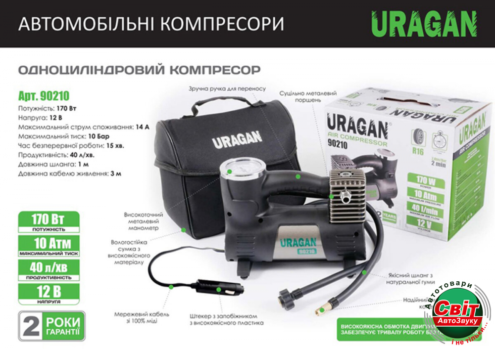 - › Компресор автомобільний Uragan 10 Атм 40 л/хв 170 Вт 90210