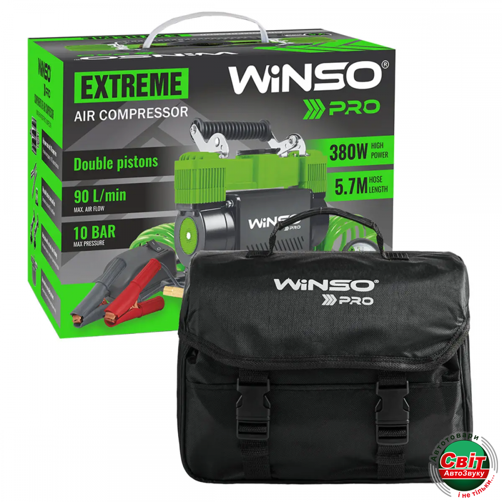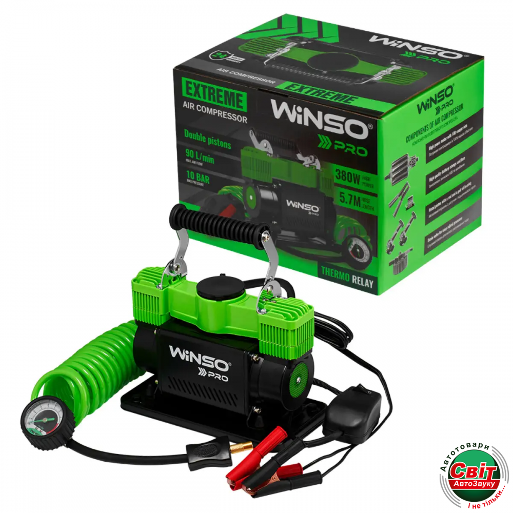 Компресор автомобільний Winso Pro Extreme 12В, 10 Атм, 90 л/хв із зажимами АКБ (137000)Компресор Winso Pro Extreme призначений для виходу їз ситуацій з випадковими ушкодженнями колеса, зокрема його пробиття, відсутності чи недостатньому тиску. З різних причин тиск в автомобільних шинах стає менше нормального рівня. Іноді, навіть покупка дорогої і якісної гуми не страхує від проколу шини, або від факту, що рано, чи пізно стиснене повітря може почати проникати через стінки покришки. Кожен автомобіліст повинен знати як впораєтись з цим головним болем.
