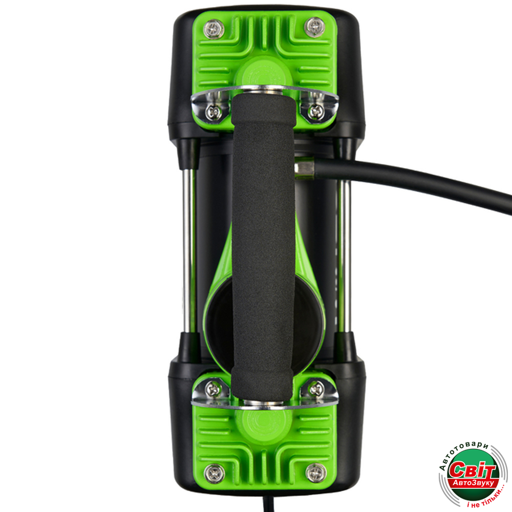 Незамінний пристрій в транспортному засобі для тих, кому важливе безпечне і комфортне використання автомобіля. Без проблем піднімає тиск в шинах до необхідного рівня за рахунок великого максимального тиску, який становить 10 атм. Досить швидко накачає необхідне спущене колесо за допомогою своєї продуктивності в 90 л/хв. Компресор є двопоршневим. Завдяки довжині кабелю живлення і довжині повітряного шланга, є можливість використовувати прилад на пристойній відстані від необхідного колеса. Корпус виготовлений з міцного матеріалу, який збільшує надійність пристрою, а також збільшує максимальний час експлуатації. Пристрій використовується тоді, коли з різних причин в автомобільних шинах тиск стає менше нормального рівня.