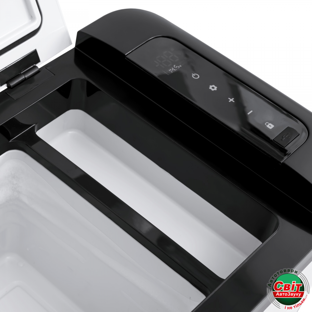 Сенсорна панель на корпусі холодильника дозволяє вмикати/вимикати пристрій, обирати режим роботи холодильника, обрати рівень захисту акумулятора авто (від розряджання), керувати температуру в камерах та блокувати сам екран.
