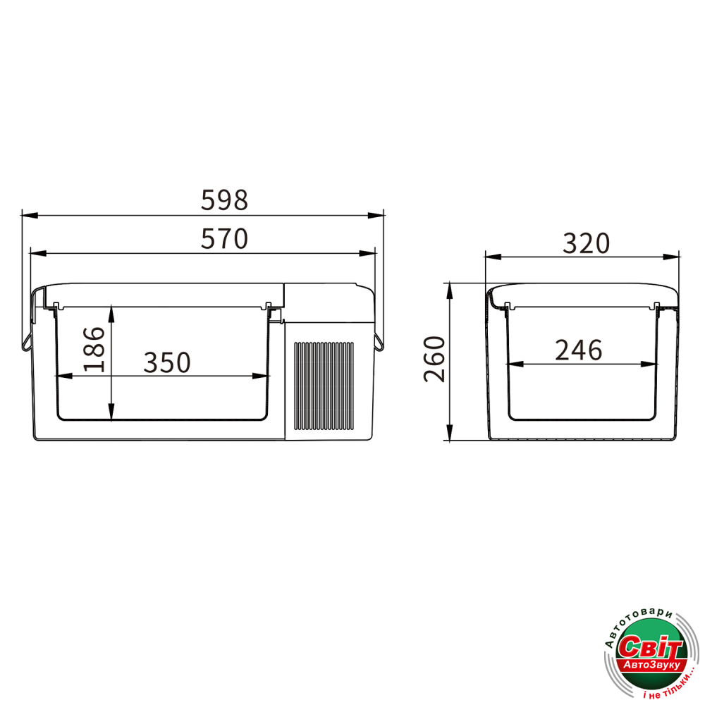 - Габаритні розміри (ВШГ): 598мм * 320мм * 260мм