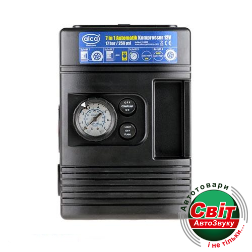 Автомобільний компресор Alca 213 000- Автомобильный компрессор Alca 213 000 - является неотъемлемой вещью в транспортном средстве. Именно он поможет избежать случайных пробитий или спустившего колеса. Компрессор фирмы Alca имеет способностью нагнетать до 17атмосфер (кг/см2), что позволит без проблем поднять давление в шинах до необходимого уровня. Также он довольно быстро накачает ваше колесо R15, около 10 минут, этому способствует производительность самого в 9л/минуту.