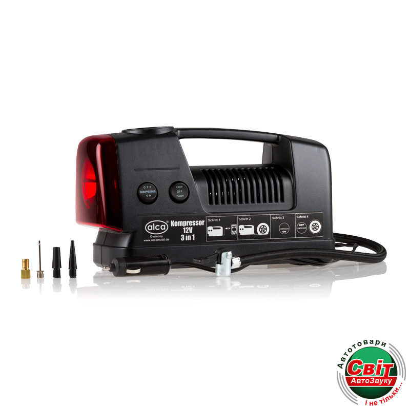 Автомобільний компресор Alca 219 000Alca 219000 "3 in 1 Nonstop" - это автомобильный компрессор с максимальным давлением 21 Атм в прочном пластмассовом корпусе с нишей под провод и шланг, манометром, аварийным фонарем и 3 насадками на шланг.