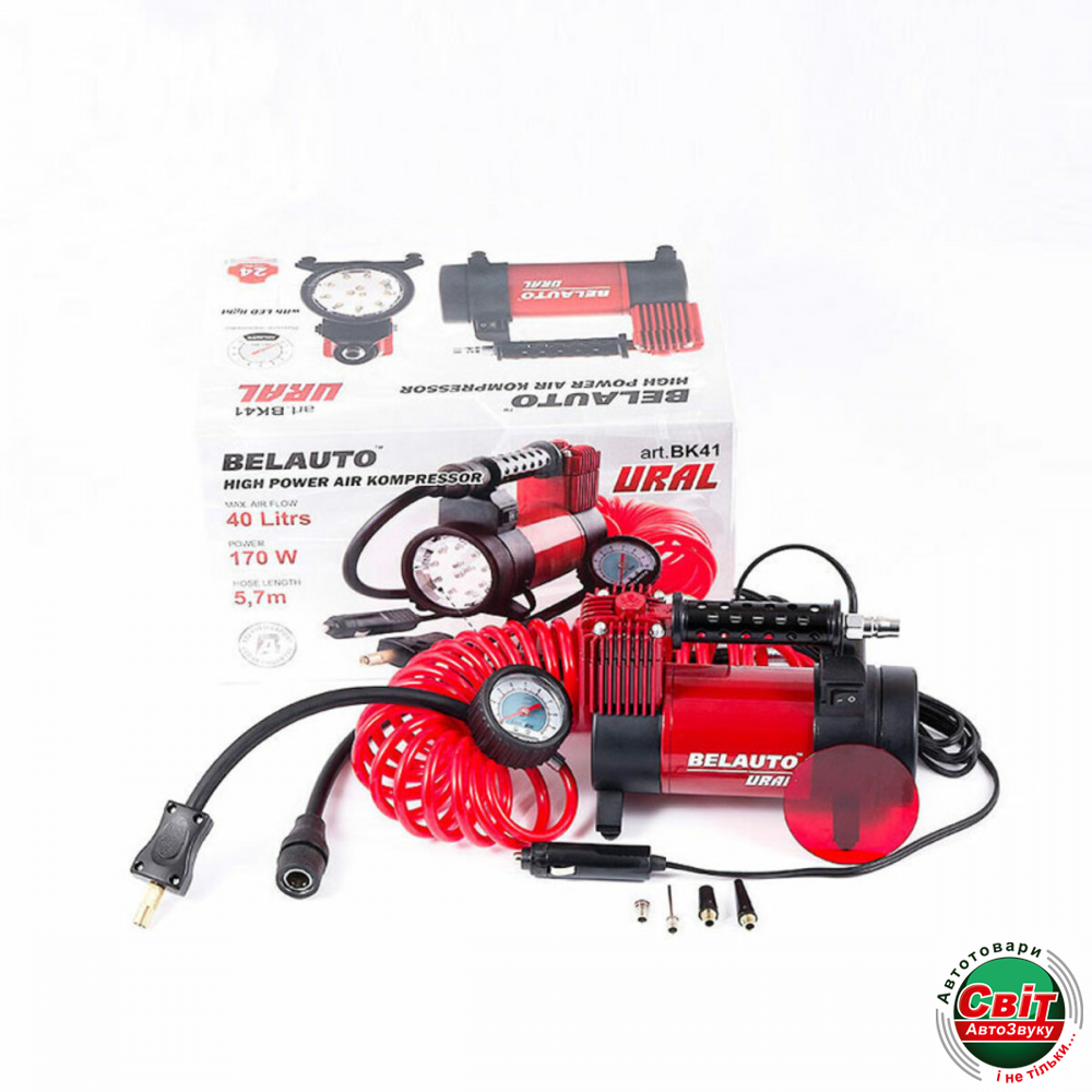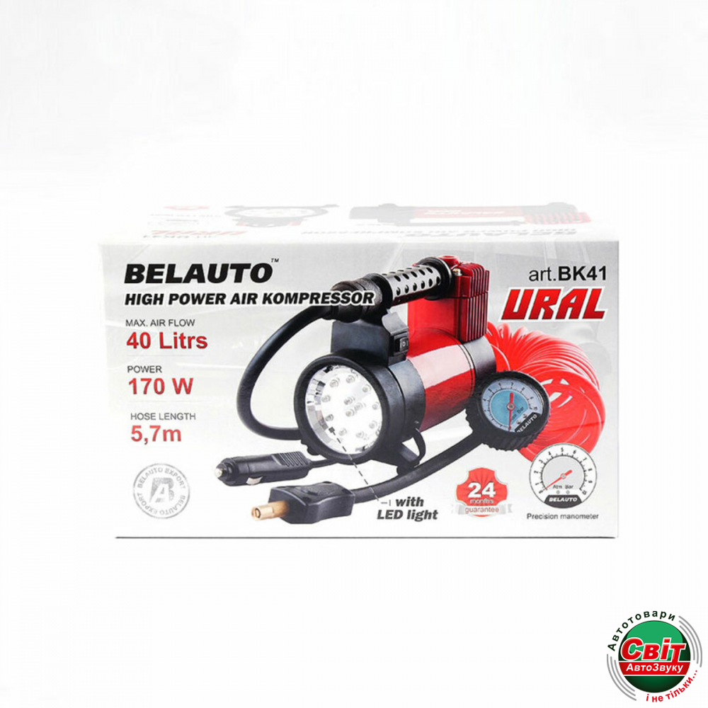 Потужність, Вт: 170Тип: ОднопоршневіТип підключення: Штекер прикурювачаПродуктивність, л/хв: 40Час безперервної роботи, хв: 20Довжина шланга, м: 5,7Довжина кабелю живлення, м: 3LED ліхтар: +Макс. струм споживання, А: 14Макс. тиск Атм, кг/см: 10Рекомендовано до колеса, R": 16Напруга, V: 12Гарантія: 24 місяціАвтокомпресор Belauto Ural БК41. Потужний LED-ліхтар. Високоточний манометр. З вмонтованим запобіжником, зручна сумка для транспортування та додаткові адаптери.Купити компресор автомобільний БЕЛАВТО БК41 УРАЛ з LED ліхтарем можна легко та дешево саме в нашому Інтернет-магазині. А легендарна польська якість перевершить усі сподівання.Характеристики