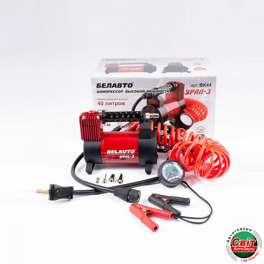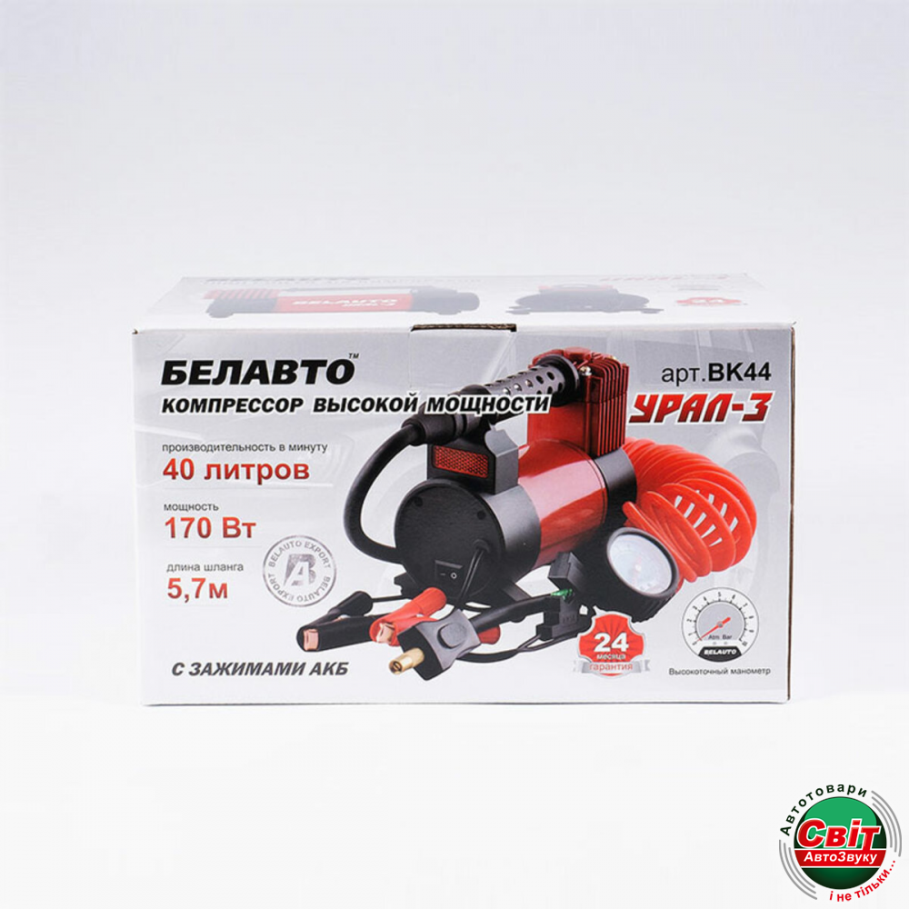Потужність, Вт: 170Тип: ОднопоршневіТип підключення: Зажими на акумуляторПродуктивність, л/хв: 40Час безперервної роботи, хв: 20Довжина шланга, м: 5,7Довжина кабелю живлення, м: 3LED ліхтар: -Макс. струм споживання, А: 14Макс. тиск Атм, кг/см: 10Рекомендовано до колеса, R": 16Напруга, V: 12Гарантія: 24 місяціКомпресор автомобільний Belauto Ural-3 БК44 із зажимами АКБ. Високоточний манометр з вмонтованим запобіжником, зручна сумка для транспортування та додаткові адаптери.Купити компресор автомобільний БЕЛАВТО УРАЛ-3 можна легко та дешево саме в нашому Інтернет-магазині. А легендарна польська якість перевершить усі сподівання.