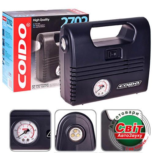 Автомобільний компресор COIDO 2702Надежный и удобный в применении автокомпрессор COIDO 2702 в прочном пластмассовом корпусе можно использовать как для накачивания автомобильных колес, так и в быту. Продуктивность данного компрессора составляет 12 л/мин. Сразу после включения штекера в розетку прикуривателя, компрессор готов к работе, не создавая помех бортовому компьютеру. Защитная система автоматического отключения питания при перегрузке поможет избежать поломок. В комплект входит три адаптера для накачивания надувных резиновых изделий. Длина шнура питания составляет 2,9 м, длина шланга 0,5 м. Также компрессор оснащен фонариком, который поможет в темное время суток.