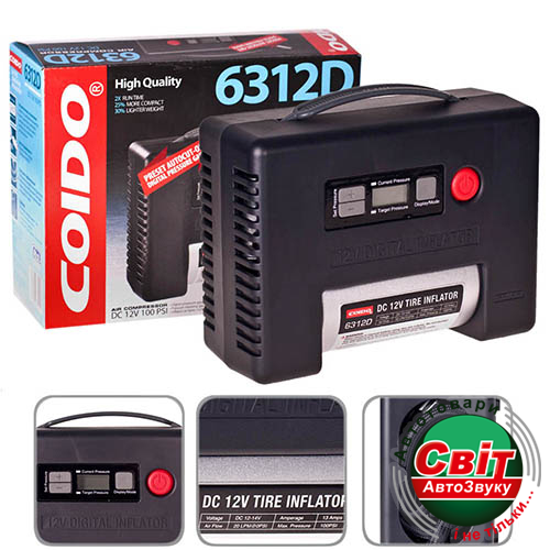 Автомобільний компресор COIDO 6312DНадежный и удобный в применении автокомпрессор COIDO 6312D в прочном пластмассовом корпусе можно использовать как для накачивания автомобильных колес, так и в быту. Продуктивность данного компрессора составляет 20 л/мин. Сразу после включения штекера в розетку прикуривателя, компрессор готов к работе, не создавая помех бортовому компьютеру. Защитная система автоматического отключения питания при перегрузке поможет избежать поломок. В комплект входит три адаптера для накачивания надувных резиновых изделий. Длина шнура питания составляет 2,9 м, длина шланга 0,5 м. Также компрессор оснащен функцией автостоп, которая автоматически отключит компрессор при достижении заданного давления в колесе.