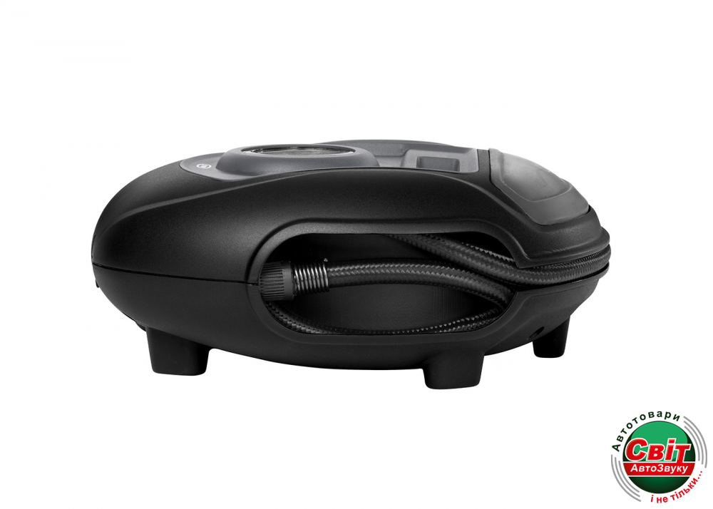 У цьому компресорі облаштований манометр, що позначає тиск у PSI, BAR або кПа. Крім того, тут є шланг достатньої довжини і міцності, він має спеціальний відсік для зберігання, що запобігає можливості перегину в складеному вигляді. З'єднувач також виконаний такої форми, щоб користувач міг легко дістатися до клапанів, які розташовані у важкодоступних місцях на покришці.