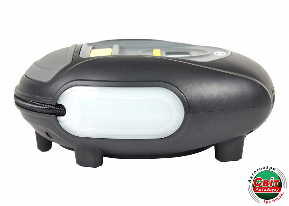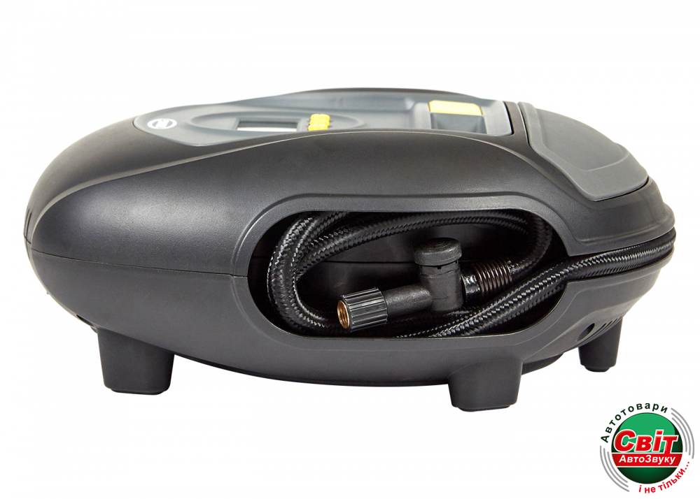 Тут також передбачено вимірювання тиску в різних одиницях, а наявність великого цифрового манометра дає можливість точно визначити всі потрібні показники. Додатково тут облаштований шланг, що має необхідний відсік для зберігання, що запобігає ймовірність перегину вироби. Також тут передбачено з'єднувач клапанного стрижня, який забезпечує швидке під'єднання до незручно розташованих шинним клапанів.