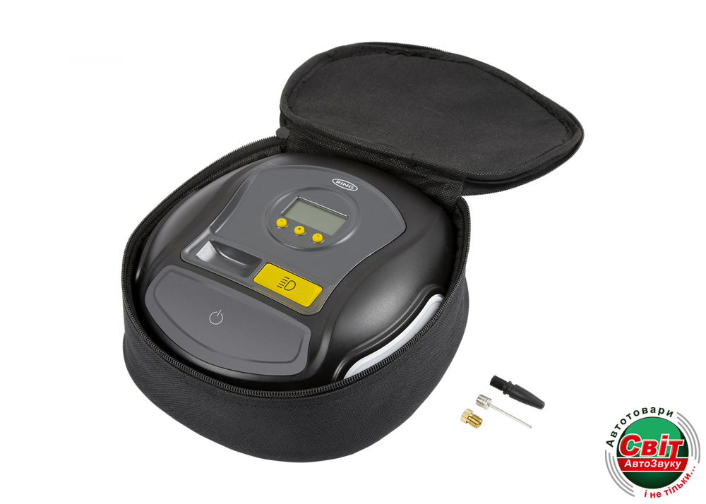 Компресор з автостопом Ring RTC600 здатний швидко накачати шину, всього за 3 хвилини. Додатково оснащений цифровим манометром, LED ліхтарем і кейсом для його зберігання. Широкий функціонал і якісне виконання відрізняють цю модель і роблять її більш популярною для повсякденного використання.