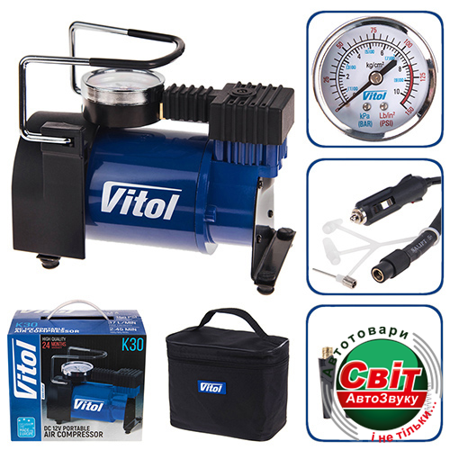 Компресор автомобільний Vitol K-30 призначений для накачування автомобільних коліс або інших надувних виробів. Дана модель обладнана шлангом довжиною 100см і манометром для контролю роботи. Компресор працює від 12В, а максимальний тиск становить 10атм. Час безперервної роботи становить до 30 хв. Серед інших відмінностей Vitol K-30 відзначимо високу продуктивність, металевий корпус, захист отгрева, мала вага і якісну заводську збірку.