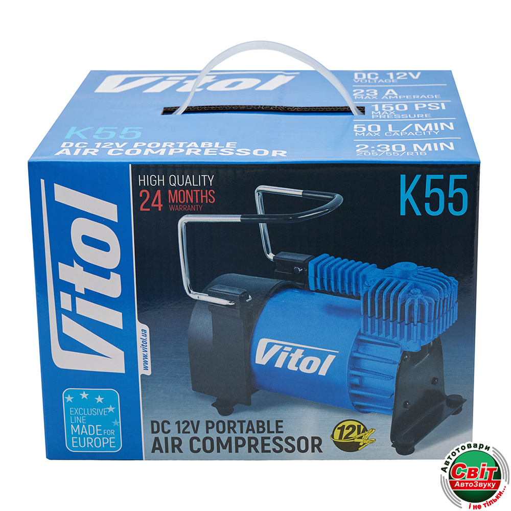 Компресор автомобільний Vitol K-55 призначений для накачування автомобільних коліс або інших надувних виробів. Дана модель обладнана спіральним шлангом довжиною 500см і манометром для контролю роботи. Компресор працює від 12В, а максимальний тиск становить 10атм. Час безперервної роботи становить до 30 хв. Серед інших відмінностей автокомпресора Vitol K-55 відзначимо кнопку скидання повітря, високу продуктивність, металевий корпус, мала вага і якісну заводську збірку.