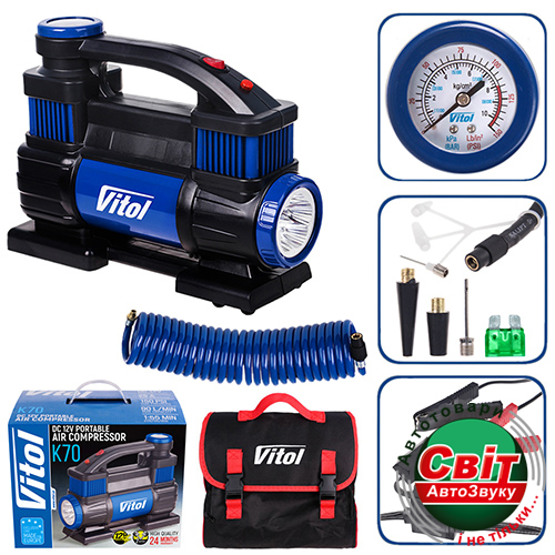 Компресор автомобільний Vitol K-70Двоциліндровий компресор, призначений для накачування автомобільних коліс або інших надувних виробів. Дана модель обладнана спіральним шлангом довжиною 500см і манометром для контролю роботи. Компресор працює від 12В, а максимальний тиск становить 10атм. Час безперервної роботи становить до 30 хв. Серед інших відмінностей автокомпресора Vitol До-70 відзначимо кнопку скидання повітря, високу продуктивність, LED ліхтар, металевий корпус, мала вага і якісну заводську збірку.
