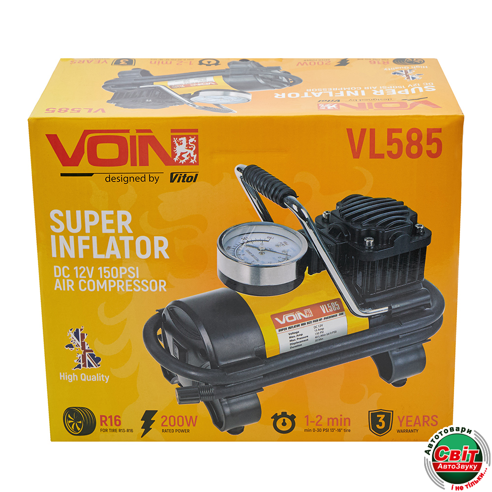 Компрессор автомобильный Voin VL-585Компрессор автомобильный Voin VL-585 предназначен для накачивания автомобильных колес или других надувных изделий. Данная модель оборудована шлангом длиной 100см и манометром для контроля работы. Компрессор работает от 12В, а максимальное давление составляет 10атм. Время непрерывной работы составляет до 30мин. Среди прочих отличий Voin VL-585 отметим высокую производительность, металлический корпус, малый вес и качественную заводскую сборку.