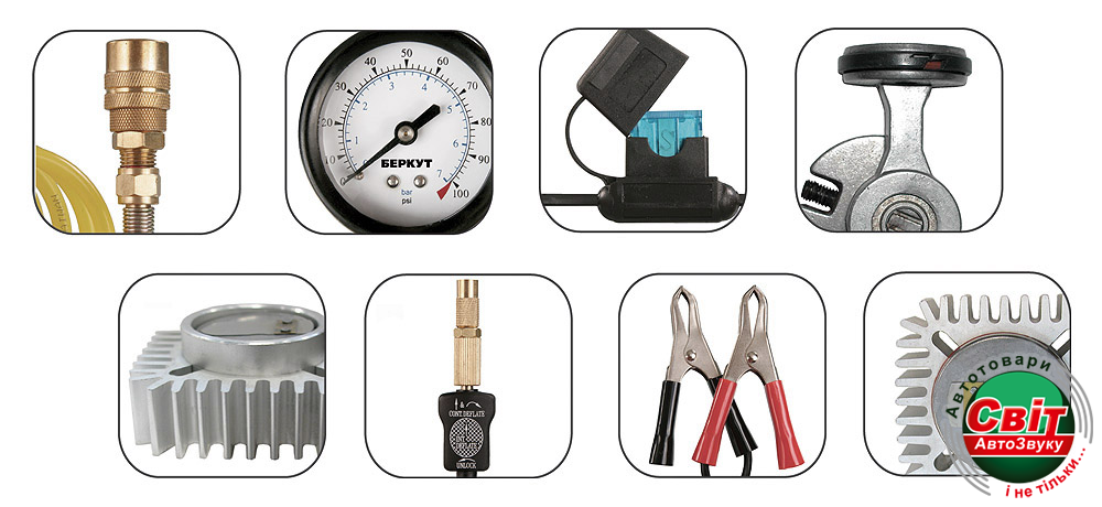 У компресора БЕРКУТ R17 компактні розміри, але велика робоча потужність. Тому компресор під'єднується безпосередньо до клем акумуляторної батареї.