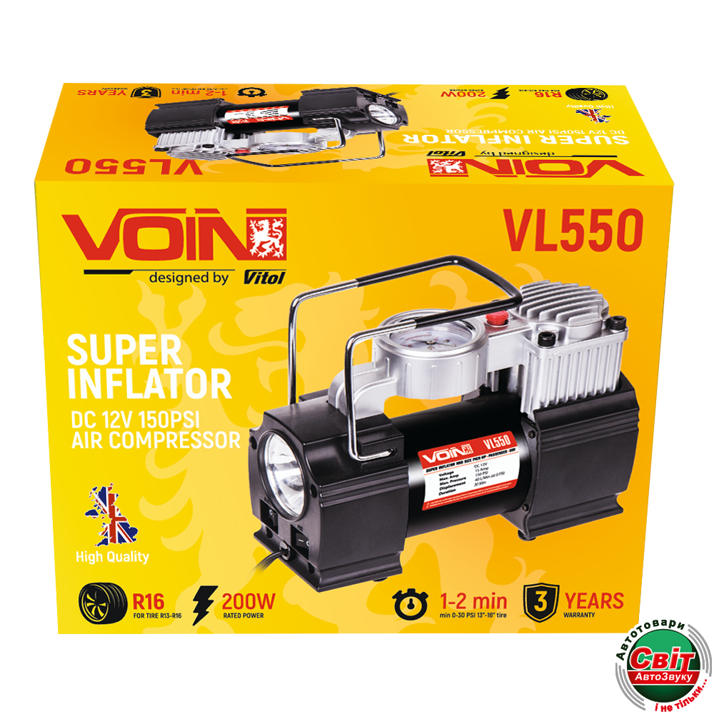 З високопродуктивним автокомпресором VOIN VL-550 ви завжди зможете накачати колесо свого автомобіля, м'яч, велосипедну шину або навіть надувний човен невеликого розміру. Компресор працює як від прикурювача і є абсолютним чемпіоном за продуктивністю компресорів, що підключаються до прикурювача автомобіля. VOIN VL-550 можна також під'єднувати до клем акумуляторної батареї автомобіля завдяки перехіднику, який постачається в комплекті.