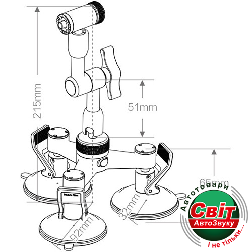 - Размеры: Радиус базы: 92 мм; Радиус активной присоски: 32 мм; Длина половины универсального шарнира: 51 мм; Максимальная высота: 215 мм