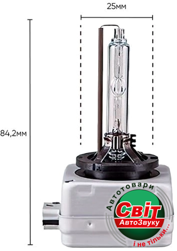 Цоколь D1S/PK32d-2, має два контакти, з палієм розташованим прямо на лампі. Призначений для головної прожекторної оптики ("лінзованих" фар), а саме далекого та ближнього світла. Робоча напруга 85 В. Потужність 35 В. Колба виготовлена із кварцового скла, що захищає від УФ-випромінювання, це світлове рішення забезпечує максимальну безпеку, дозволяючи водіям бачити ще далі. Колірна температура 4300 К, вона вважається ідеальною не тільки для повноцінного освітлення дорожньої ділянки, а й для очей водія – не знижує концентрацію уваги та не втомлює зір.