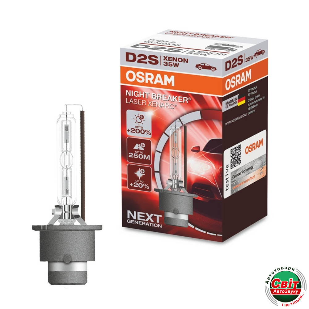 Ксенонова лампа Osram D2S Night Breaker Laser +200% (66240XNL) (1pcs carton)Ксеноновая лампа серии Xenarc Night Breaker Laser, послужат отличной заменой для штатной оптики, или галогенных ламп при правильном подборе комплектующих (блок розжига, провода подключения). Данная лампочка гарантирует свет больше по яркости на 200%, нежели обычные ксеноновые лампы. Это значительно увеличивает обзор, что позволяет быстрее реагировать на опасные ситуации в темное время суток и в периоды плохой видимости. Помимо этого, светящийся поток данной лампы продолжительнее на 250 метров и до 20% белее свет. Ксенон менше нагрівають фару, і ймовірність появи тріщин на них, знизилася, що особливо важливо в дощову погоду.