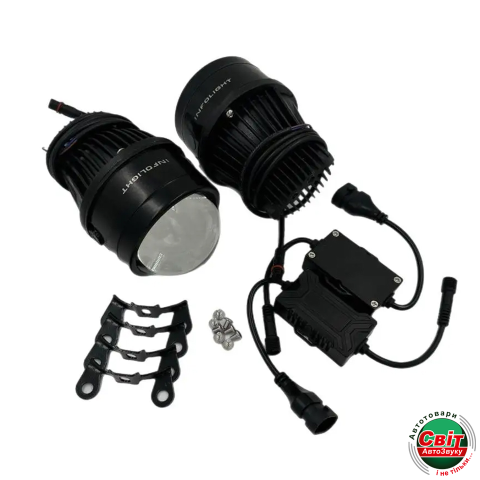 Лінзи світлодіодні Infolight Fog LED-Lense (пара)Світлодіодні лінзи Infolight Fog LED-Lense 3,0` призначені для встановлення в протитуманні фари. Вони можуть працювати у двох режимах (жовтий/біле світло). Дані біл лінзи працюють від напруги бортової мережі 12 В / 24 В, що дозволяє встановити їх на легкові авто, мототехніку та вантажівки. Встановлені в модулі світлодіоди забезпечують гарне освітлення дороги у будь-який час.