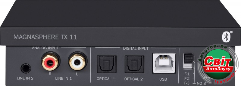 Небольшой передатчик Magnasphere TX11 выполняет функцию коммутационного блока, получающего сигнал различными способами. Это может быть аналоговый кабель с разъемами RCA или 3,5-мм «джеком», оптический кабель или USB, передающий цифровой поток с компьютера. Кроме того, можно использовать Bluetooth, для чего имеется соответствующий модуль с поддержкой aptX.