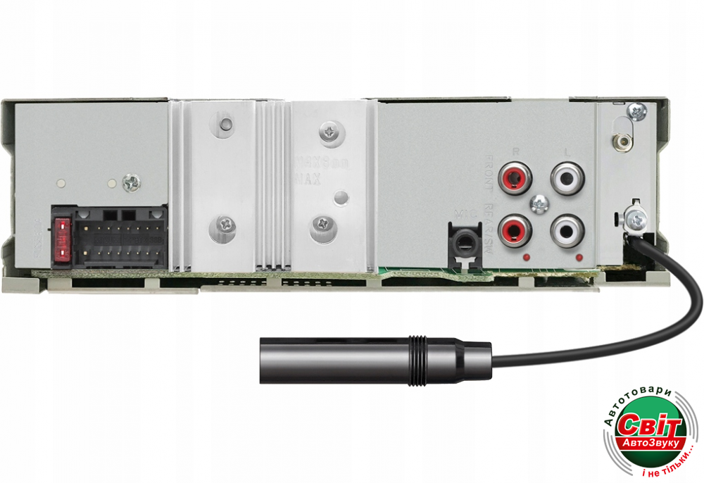 - З'єднання: передній USB та AUX вхід, підтримка зовнішнього мікрофона, роз'єм для антени DAB