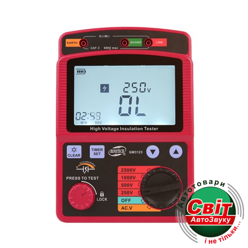 GM3123 - мегаомметр, измеритель изоляции производства компании Benetech. Данный мегаомметр предназначен для измерения значений сопротивления изоляции. Тестовое напряжение измерителя сопротивления изоляции: от 250 до 2500 В, ток короткого замыкания не выше 1,4 мА. В мегаомметре GM3123 Benetech реализованы функции измерения переменного и постоянного напряжения до 600 Вольт. Особенностью данного измерителя сопротивления изоляции является функция установки таймера для тестирования изоляции, и блокировка кнопки тестирования для предотвращения от случайного запуска тестера. Также стоит отметить наличие ручного выбора диапазона тестирования и функций индикации слабого заряда батарей. GM3123 имеет разъём питания для подключения внешнего источника питания 12 В, DC.