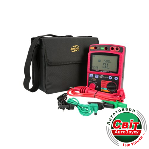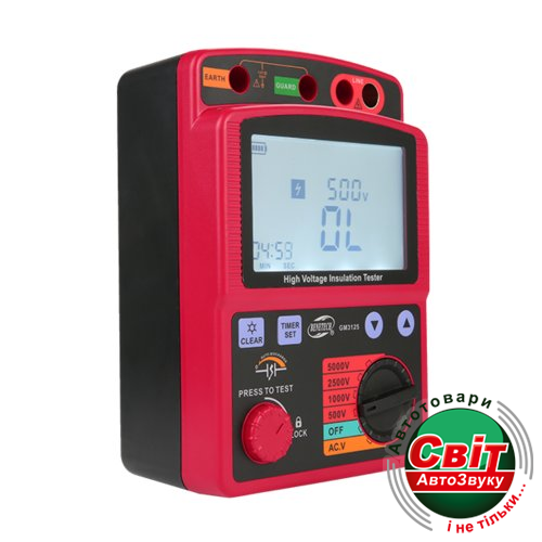 Мегаометр Benetech GM3125GM3125 - мегаомметр, измеритель изоляции производства компании Benetech. Мегаомметр GM3125 предназначен для измерения значений сопротивления изоляции. Тестовое напряжение от 500 до 5000 В, ток короткого замыкания не выше 1,4 мА. В данном мегаомметре реализованы функции измерения переменного и постоянного напряжения до 600 Вольт. Особенностью данного измерителя сопротивления изоляции является функция тайминга для проведения тестирования изоляции, и блокировка кнопки тестирования для предотвращения случайного запуска. Также стоит отметить наличие ручного выбора диапазона тестирования и функций индикации слабого заряда батарей.