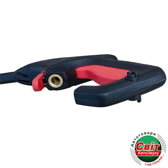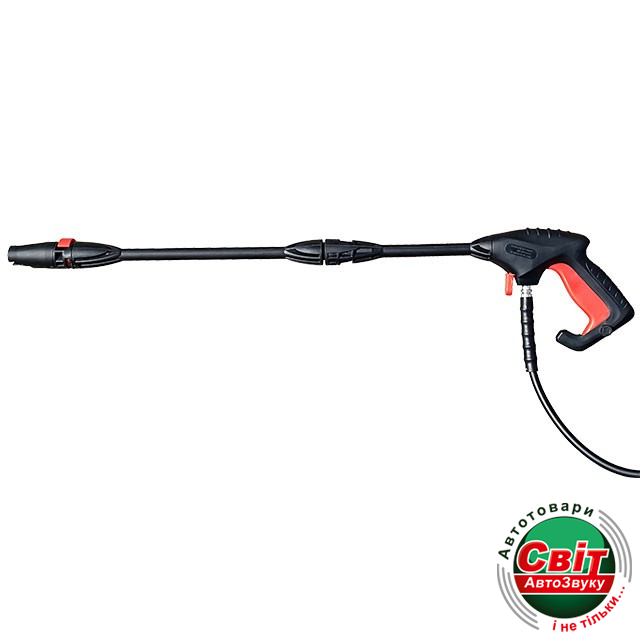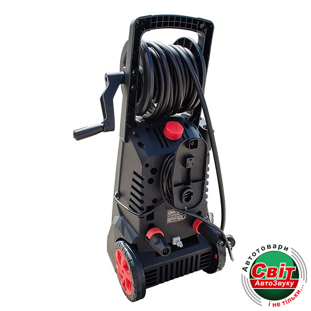 На рукоятке пистолета расположен фиксатор, необходимый для предотвращения внезапного нажатия на курок пистолета,Разъемы для подключения шлангов что бы обезопасить себя и окружающих. В комплекте с мойкой идет шланг высокого давления на катушке, а катушка вмонтирована в верхнюю рукоятку мойки. Катушка имеет складываемую рукоятку для быстрого накручивания шланга.