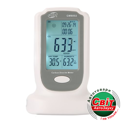 Монітор концентрации углекислого газа + термогігрометр Benetech GM8802Газоанализатор GM8802 предназначен для определения концентрации диоксида углерода (СО2, углекислого газа) в окружающем воздухе в бытовых и производственных условиях в диапазоне от 0 до 2000 ppm.