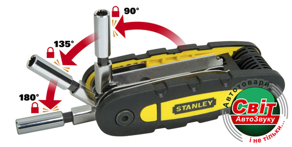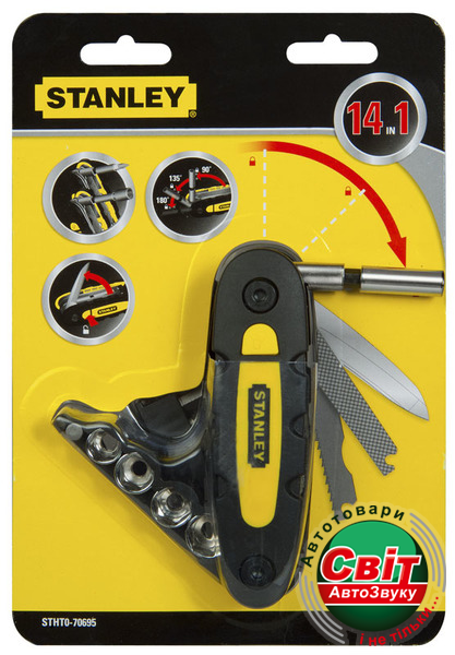 Мультитул STANLEY STHT0-70695 (14 в 1)Stanley STHT0-70695 - мультитул "14 в 1", включающий нож, пилку, напильник, держатель бит, биты и головки 1/4. Пользователю достаточно выбрать необходимый элемент набора и привести этот инструмент в рабочее положение. В этом положении есть возможность фиксации.