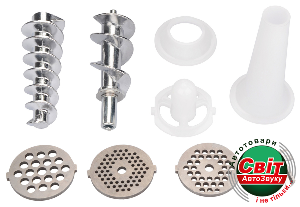 - Комплектация: М'ясорубка, Решетки (3 шт), Насадка для приготовления куббе, Насадка для приготовления домашней колбасы, лоток, Толкатель, Шнек, Инструкция