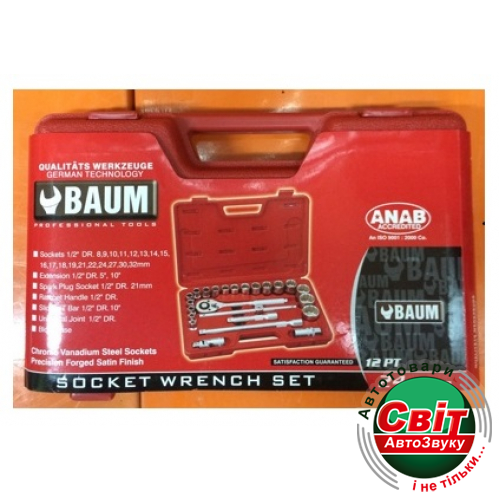 Набір інструментів Baum 237S11/2" Набор инструмента с12-ти гранными головками (8-32 мм.) – это профессиональный комплект, состоящий из 24-ох предметов. Основное применение в слесарно-монтажных работах, а так же для инструмента с квадратом присоединения 1/2".