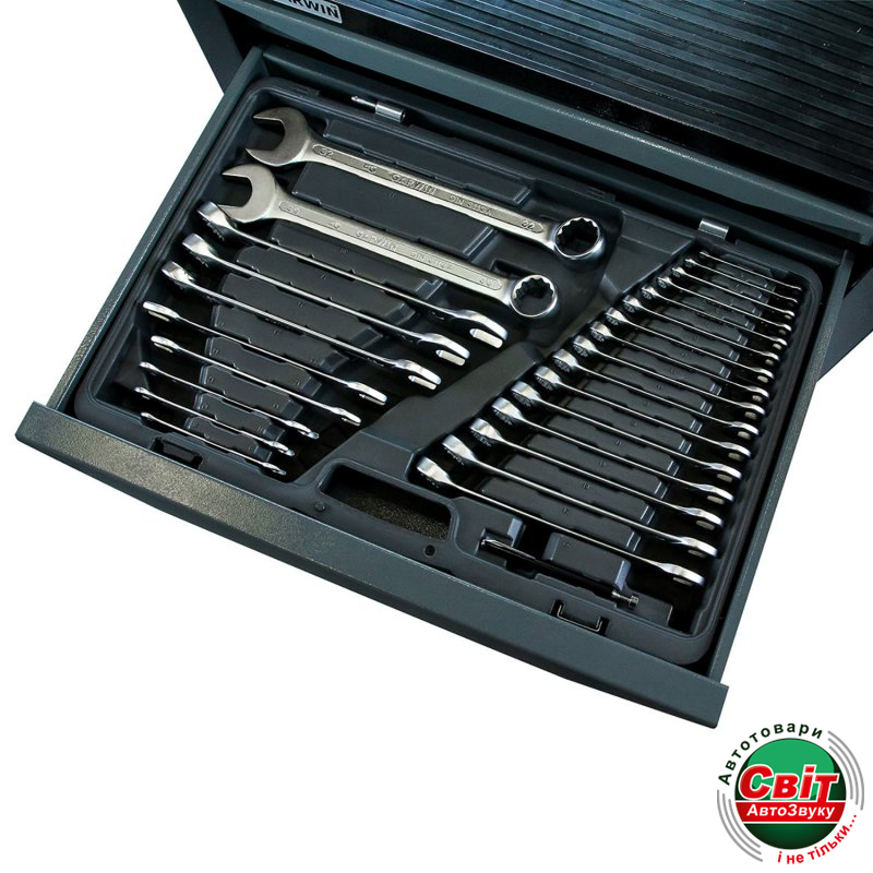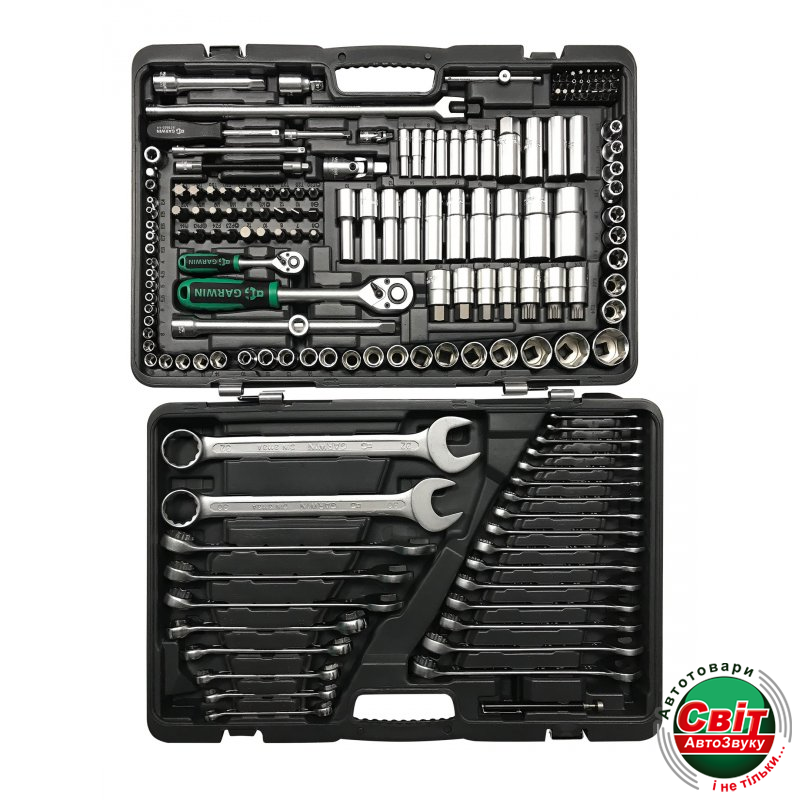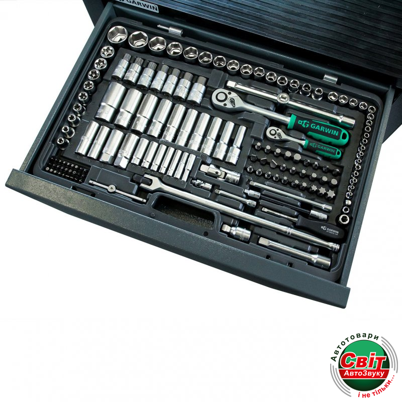 Набір інструментів GARWIN 641150Набор ручных инструментов 1/4" и 1/2" 6 гр. 169 предметов GARWIN 641150 с самым полным комплектом комбинированных ключей от 6-ти до 32-х мм, торцевых головок, бит, торцевых головок со вставками всех основных профилей и размеров. Дополняют набор аксессуары: трещотки, воротки, в том числе шарнирный, которым особенно удобно срывать и затягивать крепеж, удлинители, переходники. В состав набора также входят и разрезные ключи - незаменимы при работе с гидравлическими системами, они не слизывают грани штуцеров, обеспечивают их надежный захват. Набор обладает уникальной особенностью: петли набора позволяют разъединять его на две части, которые идеально вписываются в полки инструментальных тележек GARWIN и LICOTA. При необходимости части набора можно соединить, например, для выездного ремонта.