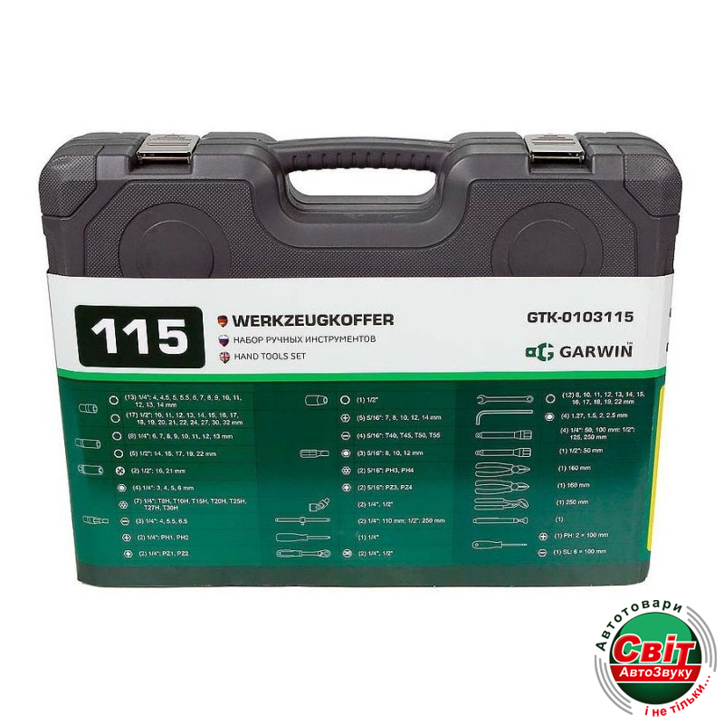 Набір інструментів GARWIN GTK-0103115Универсальный набор из 115 предметов GTK-0103115 - набор профессионального уровня. Подходит для решения различных задач в автосервисе, на производстве и в быту.