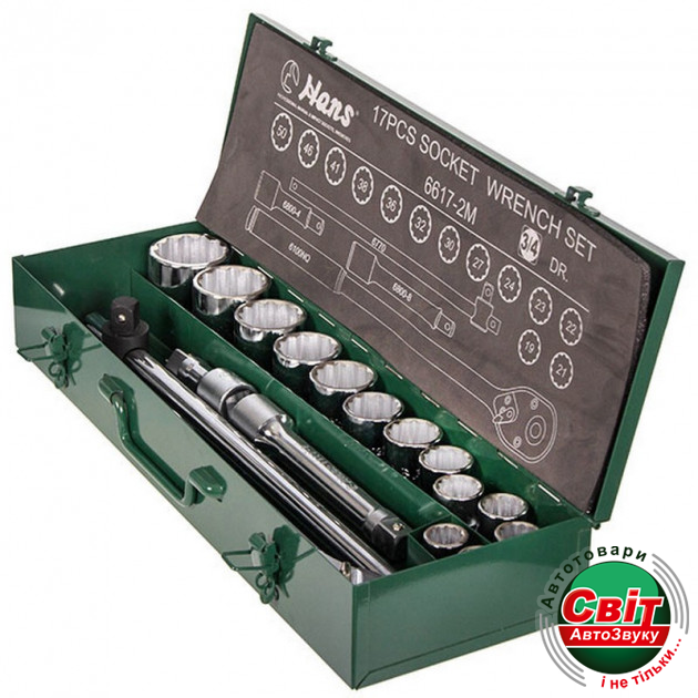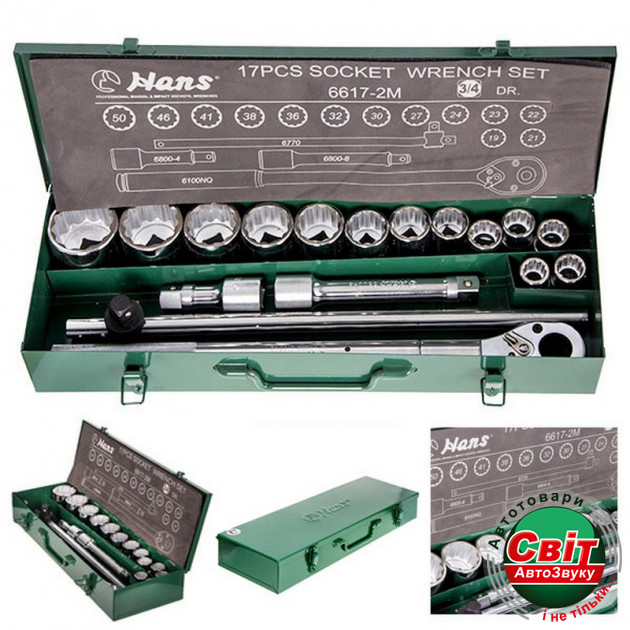 Набір інструментів Hans 6617-2M 12PT (17 предметів) 12-грНабор торцевых головок Hans с аксессуарами для работы с ними 6617-2M 12PT используется для разного рода ремонтных работ с применением не высоких усилий. Этот инструмент широко используется в ремонте любого авто и оборудования, как в домашних условиях, так и на СТO. Набор поставляется в удобном для хранения и перевозки, чемодане. Весь инструмент Hans изготавливается под жёстким контролем качества на каждом этапе производства - от выбора материала до получения готового изделия. Инструмент ТМ HANS — это профессиональный ручной авто инструмент.