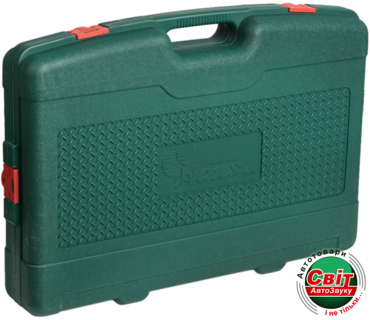 Рукоятки трещоток выполнены из пластика, отверток — из двухкомпонентного материала, а рукоятка молотка сделана из дерева. Набор оснащен пластиковым кейсом с надежными пластиковыми замками с трех сторон кейса. Кейс обеспечивает компактное хранение и удобство транспортировки.