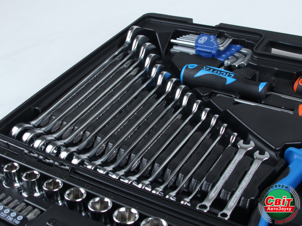 Профессиональный набор инструментов для автомобиля ALK-8009 удовлетворит самым высоким запросам - 143 предмета подобраны с учетом пожеланий Украинских покупателей. Внутри кейса найдется практически всё необходимое профессиональному автослесарю. Такой набор инструмента применим для ремонта широкого ряда техники отечественного и импортного производства. Такую возможность дает большой выбор торцевых головок: шестигранных стандартных и глубоких головок, Е-профиль (внутренний Torx, или “звездочка”), а также свечных головок с резиновой фиксацией. Набор дополняет комплект из 30 бит различного профиля. Вы сможете собрать идеальный инструмент под любую операцию, свободно комбинируя элементы этого набора.