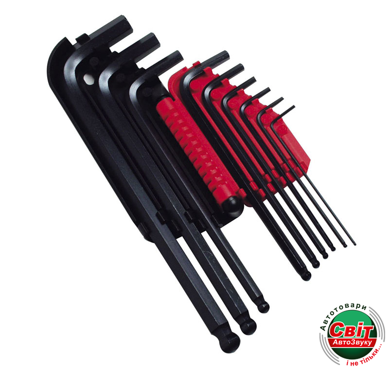 - Набір из 9-ти торцевых шестигранных Г-образных ключей с шаровидным наконечником 1,5->10мм.