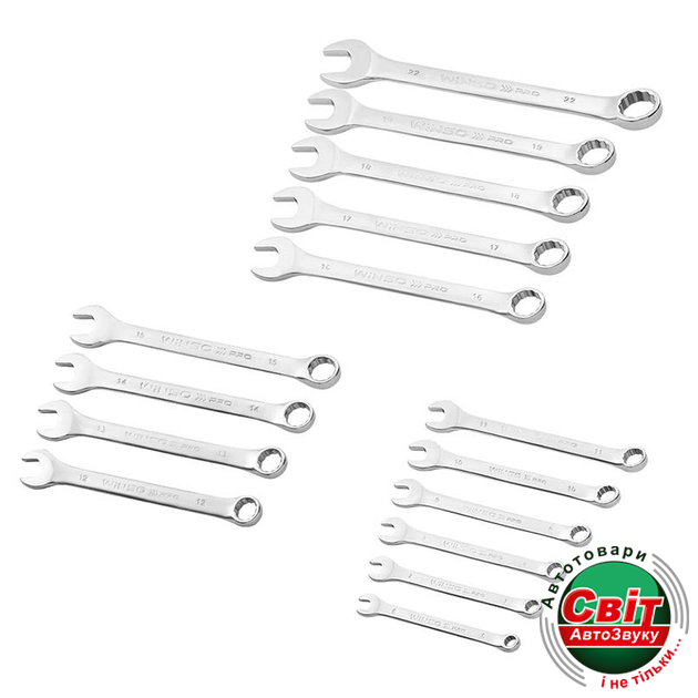 Набір комбінованих ключів Winso Pro CR-V включає 15 одиниць з розмірами від 6 до 22 мм. . Кожен ключ має нікелево-хромоване покриття, кільце під кутом 15° і відповідає стандарту DIN 3113. Поставляється в пластиковому чохлі.