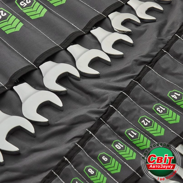 - Різноманітність розмірів: Набір включає ключі від 6 до 32 мм, що дозволяє виконувати різні види робіт, пов'язаних з кріпленням і деталями різного розміру.