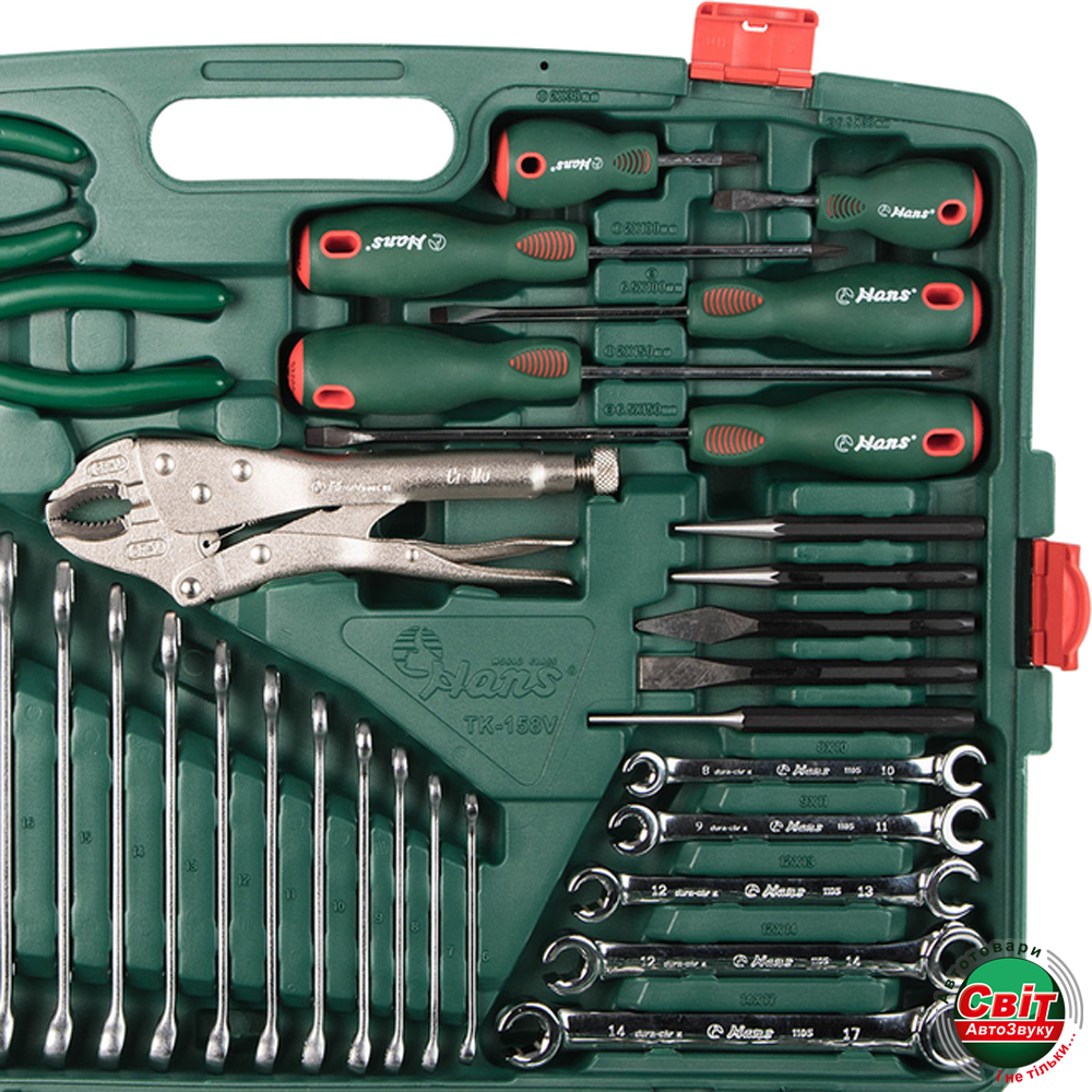 Набір інструментів Hans TK-158VFТК-158VF — ексклюзивний універсальний набір інструментів від тайванської компанії Hans Tools. Набір містить широкий арсенал інструменту зі 158 предметів. У наборі можна виділити нові, ергономічні ручки на викрутку та міцнішу ручку молотка зі скловолокна.