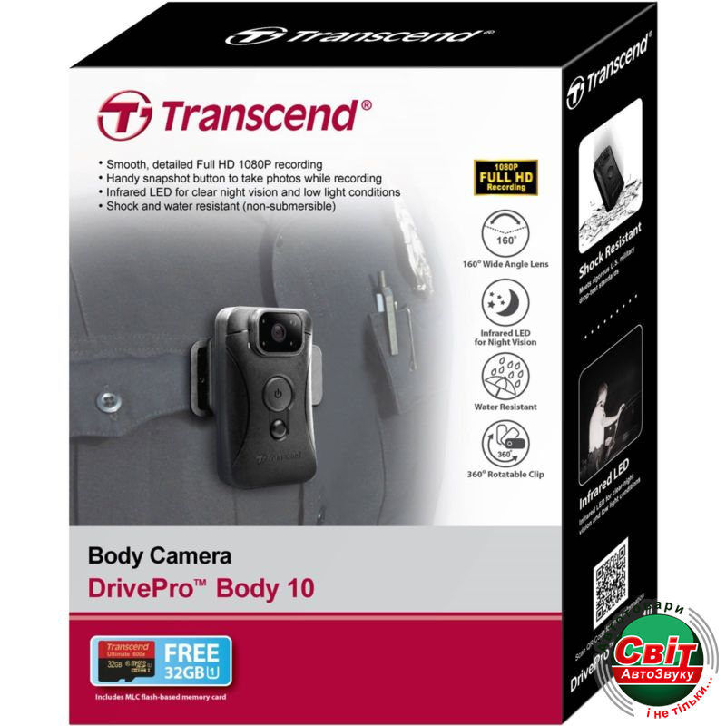 Днем или ночью, в помещении или на улице — практически в любых условиях Transcend DrivePro Body 10 станет отличным помощником для офицеров полиции, сотрудников служб безопасности и других профессионалов. Благодаря широкому углу обзора, который составляет 160°, объективу с диафрагмой ƒ/2.8 и возможности съемки с разрешением Full HD 1080P, камера способна запечатлеть малейшие детали происходящего. При низком уровне освещения будет автоматически задействована инфракрасная светодиодная подсветка, позволяющая даже ночью вести фото- и видеосъемку. Имея встроенный аккумулятор, надежный влагозащищенный и ударопрочный корпус, эта камера прекрасно приспособлена к использованию как внутри, так и вне помещения.