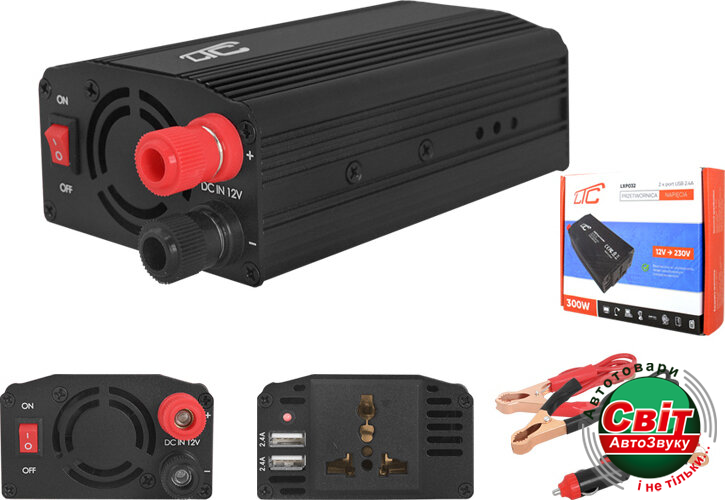 Інвертор LTC LXP032 (300W/600W) 12V-220VПризначений для перетворення постійної напруги 12 В у змінну 220В / 50Гц. Використовується для заряджання та живлення: ноутбуків, відеокамер, телефонів, всілякої аудіо- та відеотехніки та інших електроприладів.