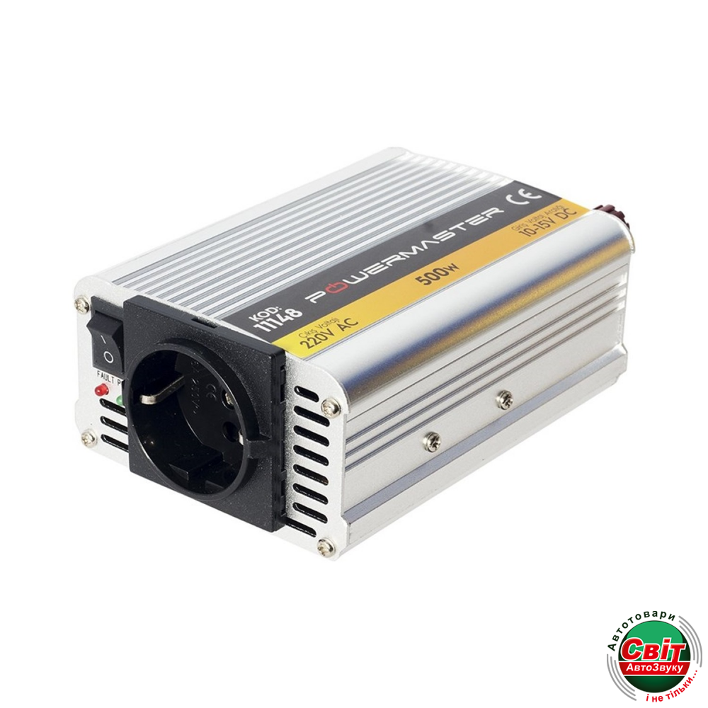 Інвертор PowerMaster 12V-220V 500WПризначений для перетворення постійної напруги 12 В у змінну 220В / 50Гц. Використовується для заряджання та роботи: ноутбуків, відеокамер, телефонів, всілякої аудіо- та відеотехніки та інших електроприладів.
