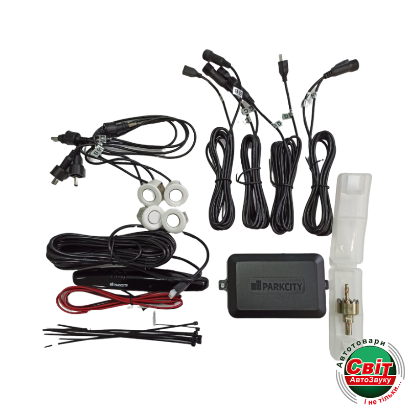 Комплектація: Дисплей кольоровий, сегментый 1322 см, Фреза для свердління отворів в бампері під датчики, 4 датчики, діаметром 18 мм, Блок управління, Проводка 4 шт, 2,1 м, Кріплення, Інструкція