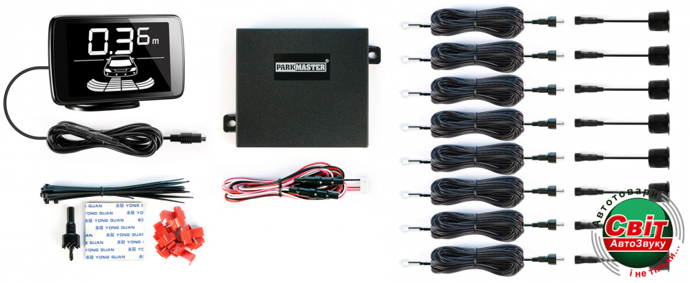 Комплект постачі ParkMaster 238-Black включає в себе LCD дисплей, вісім ультразвукових датчиків чорного кольору, блок управління, проводку для підключення та фрезу для свердління отворів під сенсори. Датчики встановлюються у задній і передній бампери транспортного засобу. При включенні передачі заднього ходу активуються чотири задніх сенсори і два бокових передніх. При відключенні передачі заднього ходу і натисканні на педаль гальма активуються всі передні датчики.